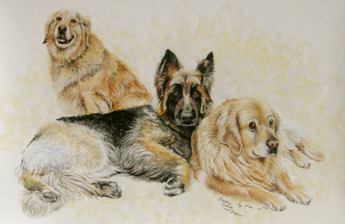 I retired from Hallmark Cards in 1998 after twenty-three creative and fun years as a corporate graphic designer. Deciding to get a pet for the family, I began my journey that included our Golden Retriever, Sadie. It all started as I began sketching her due to her abounding energy and crazy antics. Then painting these sketches, I started receiving requests from friends, local clients, galleries, as well as people from Virginia to San Francisco to paint their loved ones. I have completed a variety of commissions of family members, pets with their owners, and pets of all kinds; cats, dogs, bunnies, birds, horses and donkeys.